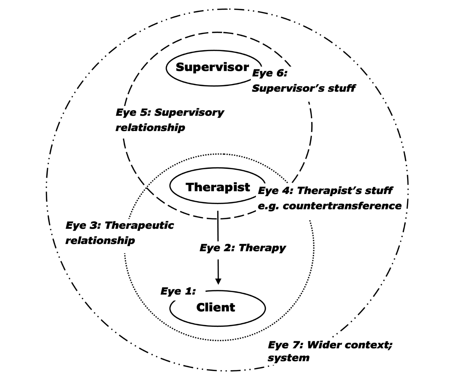 I use Shohet and Hawkin's 7-Eyed Model of Supervision (see image) as the basis for my work with supervisees. This allows us to consider and reflect on broader contextual and relational issues beyond simply the client-therapist relationship. I am interested to reflect with supervisees on what they are not bringing, as well as what they are bringing, to supervision.